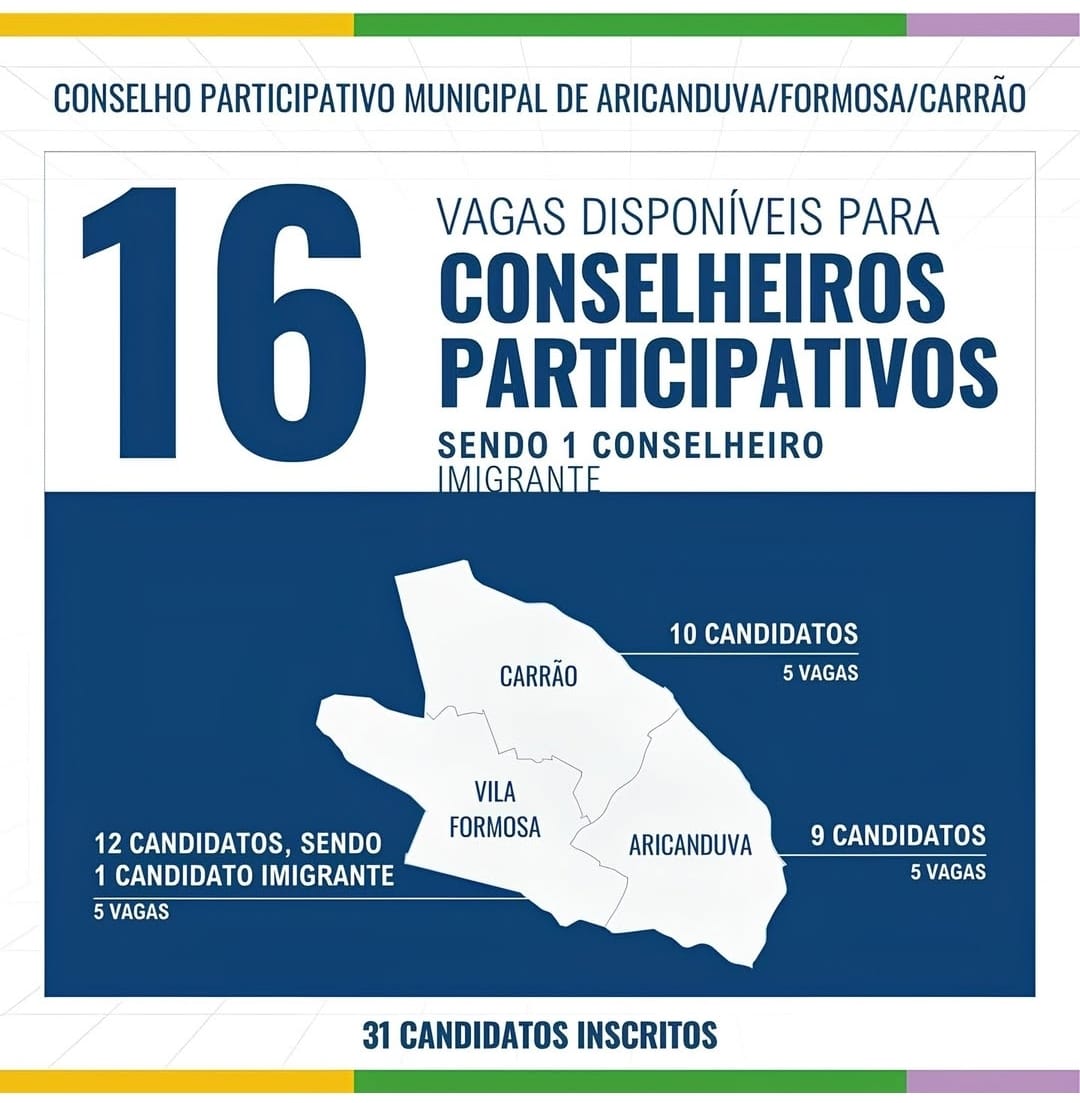 Para o Conselho Participativo Municipal Aricanduva, são 16 vagas, sendo que, ao todo, a região recebeu 31 candidatos inscritos  dos distritos de Aricanduva, Formosa e Carrão.