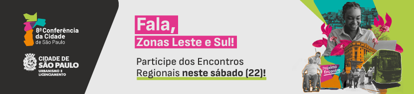 A Prefeitura de São Paulo e a sociedade civil realizam, neste sábado (22), nas Zonas Leste e Sul, mais uma etapa do Encontros Regionais para a 8ª Conferência Municipal da Cidade. Pela manhã, das 9h às 12h, o CEU Vila Alpina sediará a primeira reunião. À tarde, das 14h às 17h, será a vez do CEU Parque Bristol, no distrito de Cachoeirinha, receber os debates. Clique aqui para se inscrever.