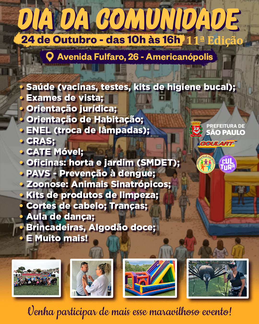 No dia 24 de outubro, das 10h às 16h, a Avenida Fulfaro, Nº 26, em Americanópolis, será palco da nova edição do Dia da Comunidade, um grande evento gratuito com muitos serviços essenciais e atividades para toda a família.