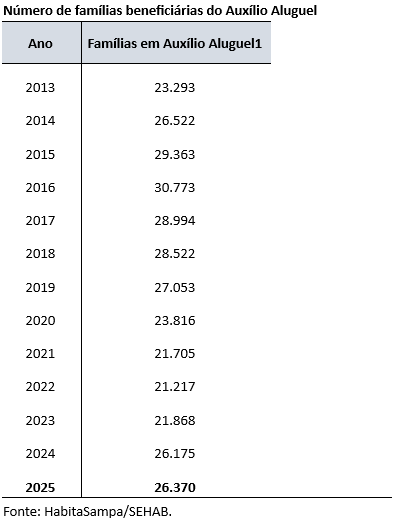 Até 2013 não há informações consolidadas sobre o número de famílias atendidas. Entre 2013 e 2015 o sistema de informações da Secretaria passou por uma série de reformulações visando maior controle e transparência, o que possibilitou o levantamento do número de famílias atendidas de maneira mais apurada. Apesar dos esforços em depurar os dados, as informações deste período podem apresentar algumas inconsistências. A partir de 2016, com a consolidação do Sistema de Pagamento do Auxílio Aluguel via cartão bancário, foi possível a produção de informações com maior confiabilidade. Abaixo segue o link para visualização das famílias que estão recebendo o benefício, com atualização diária: