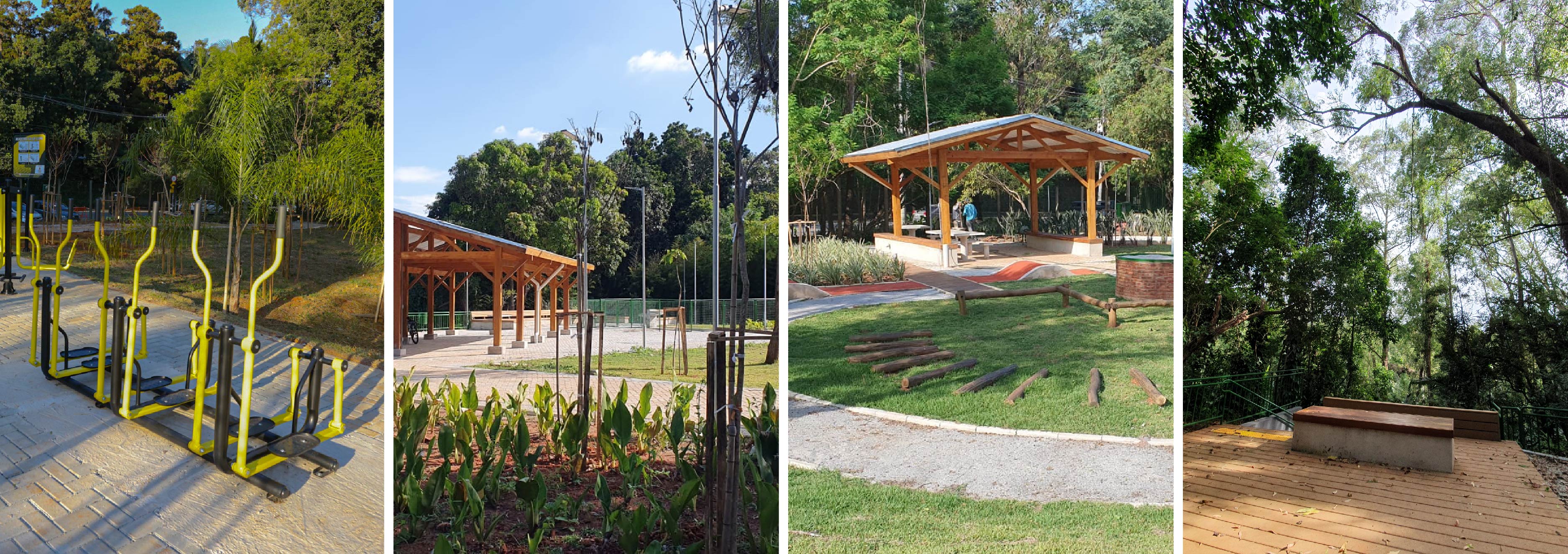 Caminhada, sanitários, bicicletário, rampa de acesso ao parque, praça com bancos e áreas de circulação acessíveis, circuito lúdico, cachorródromo, mirante e trilhas, além de equipamentos de ginástica, uma nova base de apoio aos funcionários e quiosque multiuso.