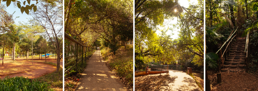 Pistas de caminhada e de ciclismo, aparelhos de ginástica, playground, paraciclos, quadra poliesportiva, palco, pista de skate, espelho d’água, sanitários e praça. Possui trilhas monitoradas, que devem ser agendadas com antecedência para grupos de até 5 pessoas. Segundo o Regulamento de Uso do Parque, os cães são permitidos apenas na área da antiga Praça Martin Luther King, desde que conduzidos com coleira e guia.