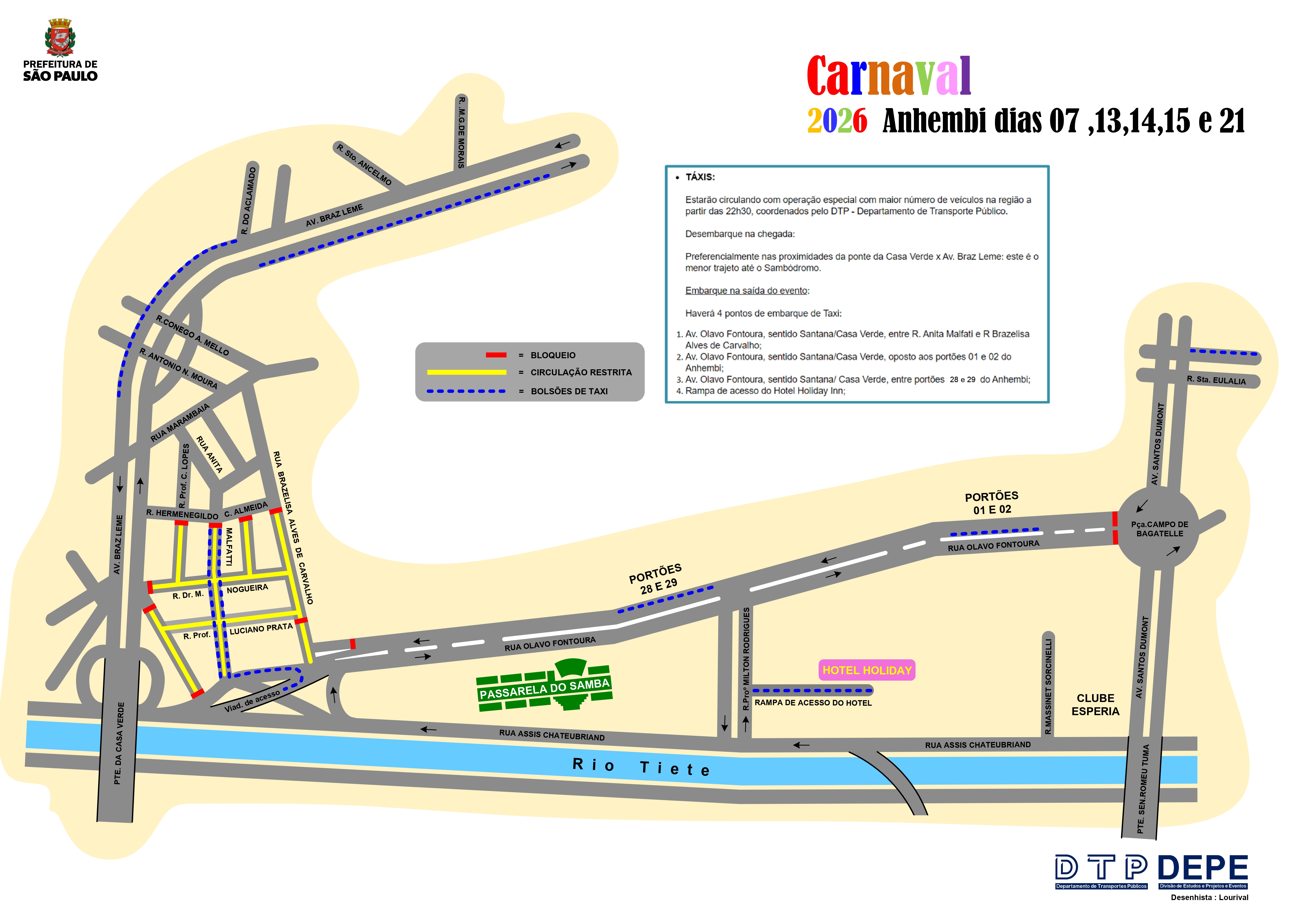 A Prefeitura de São Paulo, por meio da Secretaria Municipal de Mobilidade Urbana e Transporte (SMT) e do Departamento de Transportes Públicos (DTP), informa o esquema especial de táxis e de veículos de aplicativo para atendimento público dos desfiles de Carnaval no Sambódromo do Anhembi, na zona norte, que ocorrem entre 7 de 21 de fevereiro de 2026. O serviço de táxi no Sambódromo irá funcionar de acordo com a demanda do público no local.