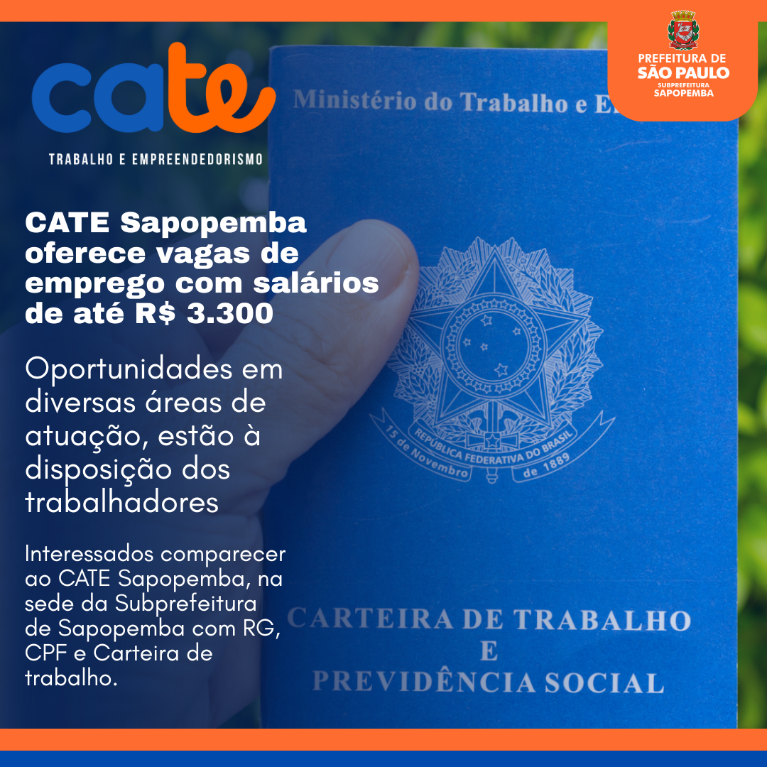 O Centro de Apoio ao Trabalho e Empreendedorismo (CATE) da unidade Sapopemba, vinculado à Secretaria Municipal de Desenvolvimento Econômico e Trabalho (SMDET), está com diversas vagas de emprego abertas para moradores da região. Os salários variam entre R$ 1.636 e R$ 3.300, além de benefícios, conforme o cargo ofertado.