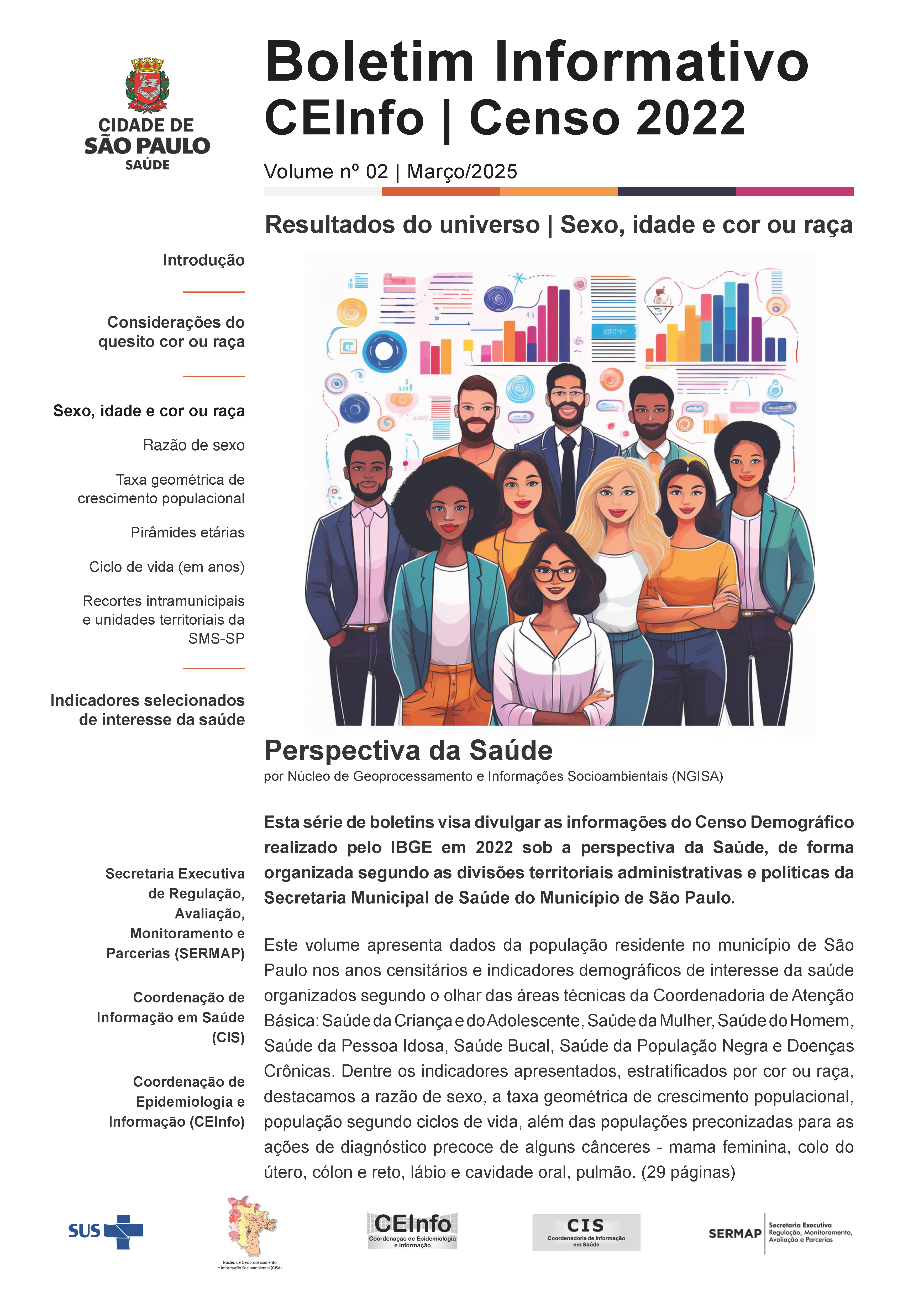 Indicadores demográficos de interesse da saúde organizados segundo o olhar das áreas técnicas da Coordenadoria de Atenção Básica: Saúde da Criança e do Adolescente, Saúde da Mulher, Saúde do Homem, Saúde da Pessoa Idosa, Saúde Bucal, Saúde da População Negra e Doenças Crônicas. Dentre os indicadores apresentados, estratificados por cor ou raça, destacamos a razão de sexo, a taxa geométrica de crescimento populacional, população segundo ciclos de vida, além das populações preconizadas para as ações de diagnóstico precoce de alguns cânceres - mama feminina, colo do útero, cólon e reto, lábio e cavidade oral, pulmão.