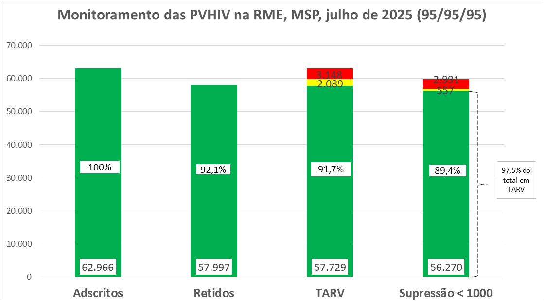 95% das pessoas que vivem com HIV diagnosticadas e em tratamento com carga viral indetectável, quando a quantidade de vírus no corpo é bem baixa.