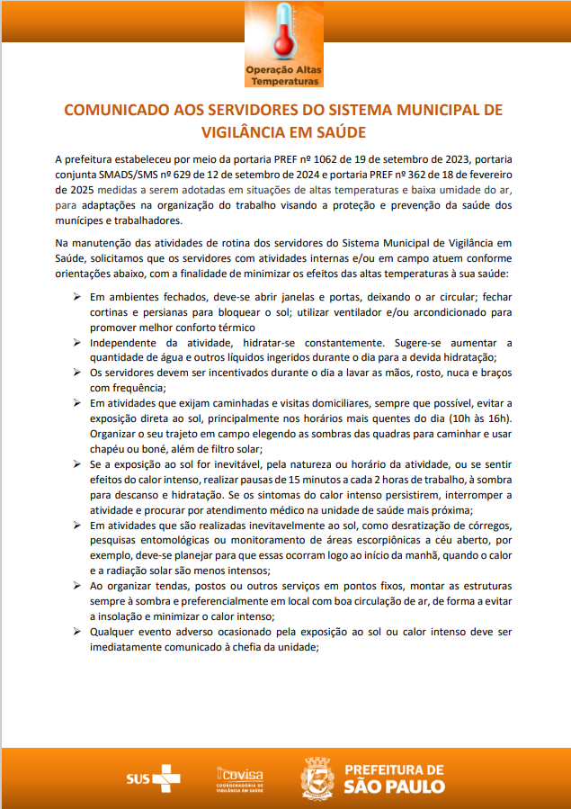 A Coordenadoria de Vigilância em Saúde elaborou um comunicado aos servidores do sistema municipal de vigilância em saúde, em decorrência das as ações relacionadas ao Plano de Contingência para Situações de Altas Temperaturas, essas mudanças bruscas de temperatura provocam a necessidade de adaptações na organização do trabalho visando a proteção e prevenção da saúde dos trabalhadores.