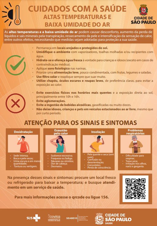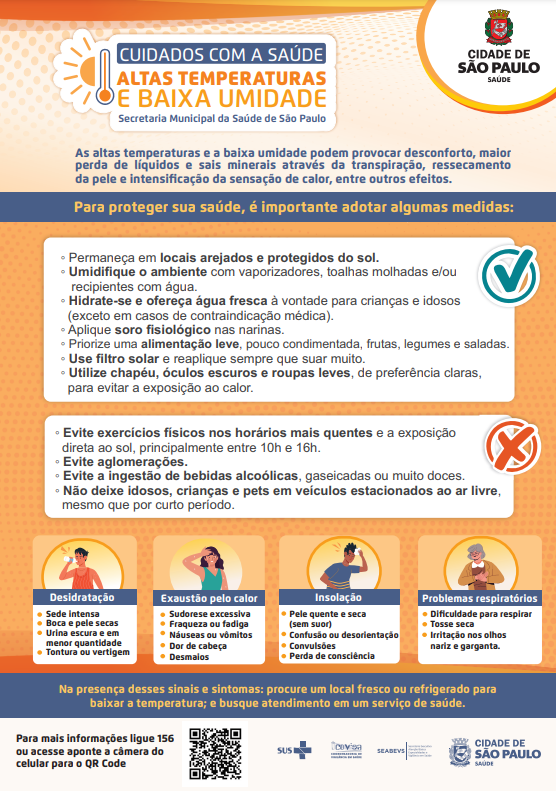 Estes documentos técnicos foi elaborado pela Secretaria Executiva de Atenção Básica, Especialidades e Vigilância em Saúde (SEABEVS), por meio da Coordenadoria de Vigilância em Saúde (COVISA) e da Coordenadoria de Atenção Básica (CAB), no âmbito da Secretaria Municipal de Saúde (SMS), com o objetivo de fornecer as principais orientações de saúde, tendo como foco a pessoa idosa e foco no ambiente escolar durante períodos de altas temperaturas e baixa umidade do ar.