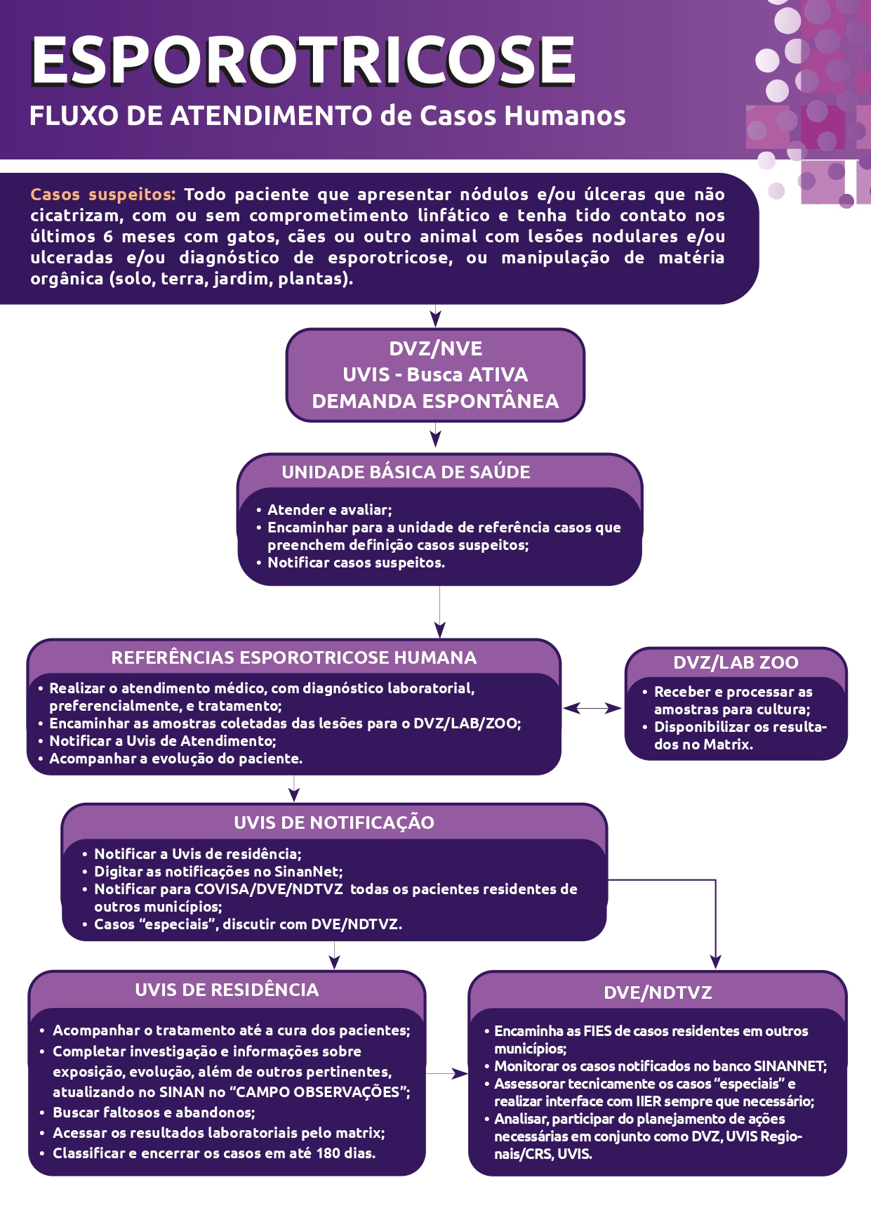 A esporotricose humana e animal não é uma doença de notificação compulsória, exceto em alguns municípios. No entanto, o Município de São Paulo, desde 2011, orienta suas unidades de saúde a notificar todos os casos suspeitos de esporotricose humana por meio da Ficha de Notificação e Conclusão (anexa).