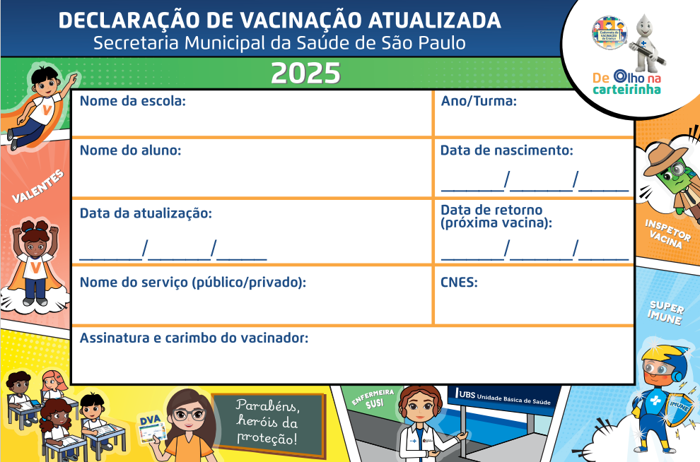 A principal estratégia do Programa Municipal de Imunizações/Covisa para a checagem do status vacinal de estudantes é a Declaração de Vacinação Atualizada (DVA), combinada às ações educativas, vacinação nas escolas e a busca ativa vacinal. A DVA trata-se de documento comprobatório de vacinação, emitido pelas Unidades Básicas de Saúde (UBS) do município de São Paulo, para entrega à escola onde a criança/adolescente frequenta. Regulamentada desde 2021, pela Portaria Conjunta SME/SMS nº1/2021, visa controlar a situação vacinal de bebês, crianças e estudantes matriculados, garantindo maior proteção da comunidade escolar contra as Doenças Prevenidas por Vacinação (DPV). A Checagem Vacinal de Estudantes 2025 ocorrerá em dois ciclos no ano: 1) Checagem Vacinal Volta às Aulas e 2) Checagem Vacinal Matrícula/Rematrícula.